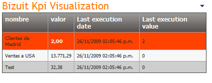 Muestra la ultima fecha y hora de ejecución del evento configurado en el indicador. Esta columna se puede ocultar deseleccionando la opción "Show last execution value" en la configuración del módulo BIZUIT KPI Visualization. El color de fondo del registro de esta columna se obtienen de la configuración de visualización del indicador y varía con respecto al valor actual del indicador. |
