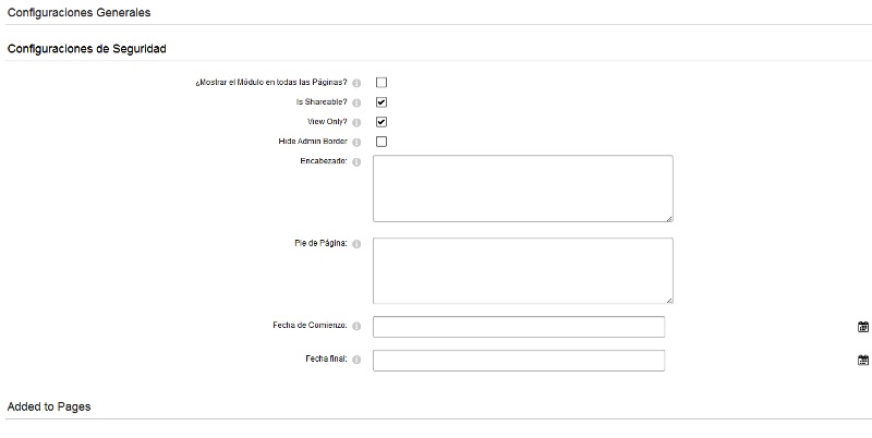 Desde la sección Configuraciones de Seguridad es posible determinar si el módulo estará disponible en todas las páginas, un encabezado y pie general, así como especificar si se desea que el módulo esté visible solamente en un determinado rango de fechas.