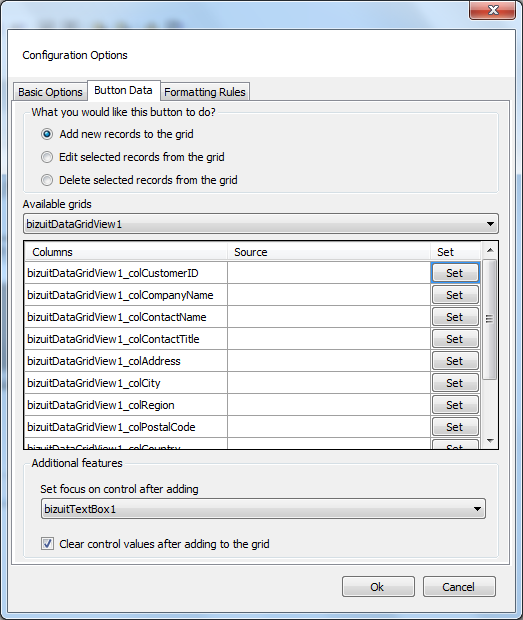 La pestaña "Button Data" se visualiza dentro de la pantalla de edición de propiedades del control AddToGridButton disponible dentro de los controles "BIZUIT Controls" al momento de editar sus propiedades permite especificar la forma en la que se agregará, editará o eliminará un registro de un control DataGridView.