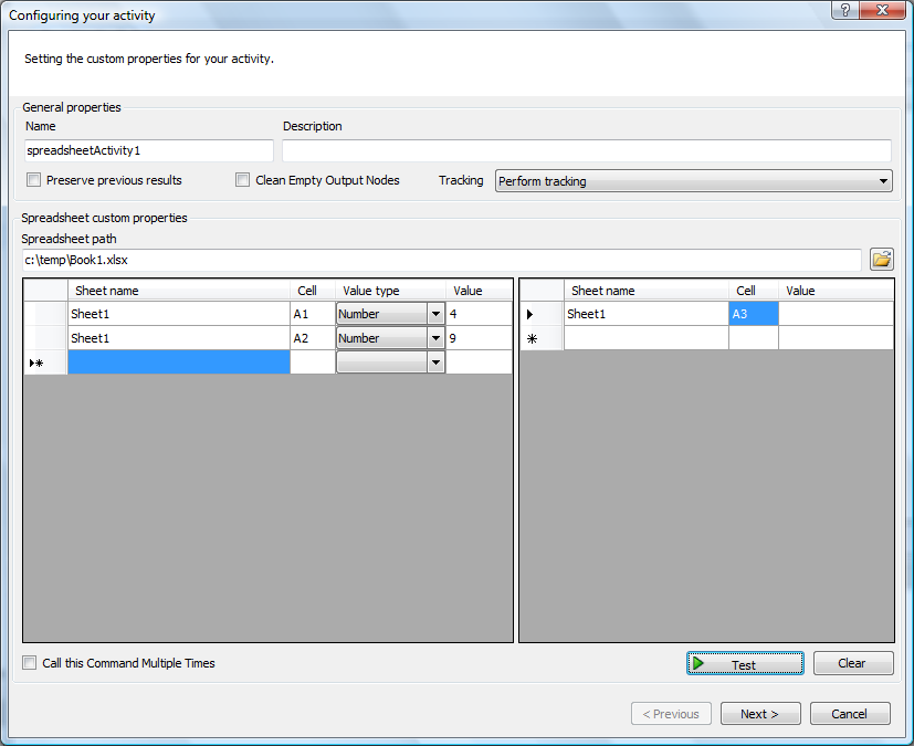 La actividad SpreadsheetActivity permite insertar y obtner valores en celdas de una hoja de cálculo Microsoft Excel permitiendo reutilizar lógica y fórmulas complejas existentes en archivos de Microsoft Excel.