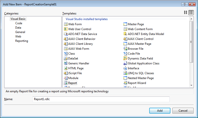 Una vez creado el proyecto, y creado un origen de datos a utilizar en el reporte, se debe agregar al proyecto el reporte a generar.