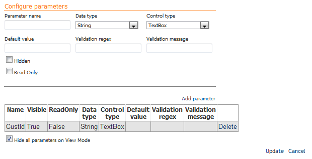 Esta opción permite ocultar los parámetros del módulo. Si se encuentra seleccionada esta opción, los parámetros se enviarán a los módulos BIZUIT Data Service existentes en la página donde el módulo BIZUIT Global Parameters se encuentre pero no podrán ser visualizados y editados por el usuario. |