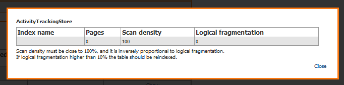 Para cada tabla muestra la siguiente pantalla en la que se indica la fragmentación de los datos de la tabla. En condiciones normales el campo "Scan density" debe aproximarse a 100, indicando que la tabla se encuentra muy poco fragmentada y el campo "Logical fragmentation" debe permanecer por debajo del 10%, de lo contrario es recomendable la realización del procedimiento de reindexación seleccionando la opción "Reindex Database".