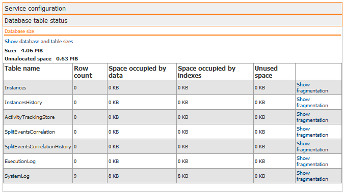 Al acceder a la configuración del servicio extendido se presenta la siguiente pantalla dividida en las secciones "Service Configuration" y "Database table status"