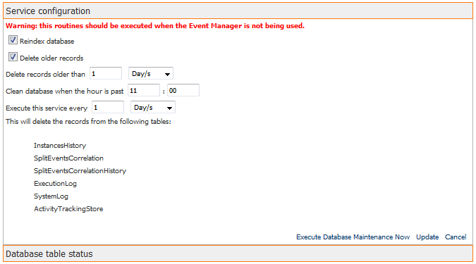 El servicio extendido "Database maintenance" permite realizar tareas de mantenimiento de la base de datos de BIZUIT Event Manager (por defecto BIZUITPersistenceStore258) manteniéndola en correcto estado de funcionamiento y minimizando el espacio utilizado por la misma.