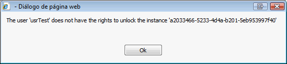 Permite bloquear o desbloquear una instancia al usuario que la bloqueó mediante la apertura de un conector asociado. Los usuarios del rol Administrators tienen permisos para bloquear o desbloquear cualquier instancia siempre y cuando la misma se encuentre asignada a dicho rol. Si el usuario logueado no es quien bloqueó la instancia y además no pertenece al rol Administrators, al intentar desbloquear la instancia recibirá el siguiente mensaje indicando la falta de permisos necesarios: