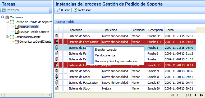 Al visualizarse el conector la instancia se bloquea de manera automática previniendo que otro usuario la modifique de manera simultánea, implementando un lockeo del tipo pesimista. Una instancia bloqueada se indica en la grilla de instancias con un color rojo de fondo. Cuando una instancia se encuentra bloqueada por un usuario, si otro usuario intenta ejecutar dicha instancia recibirá el mensaje: